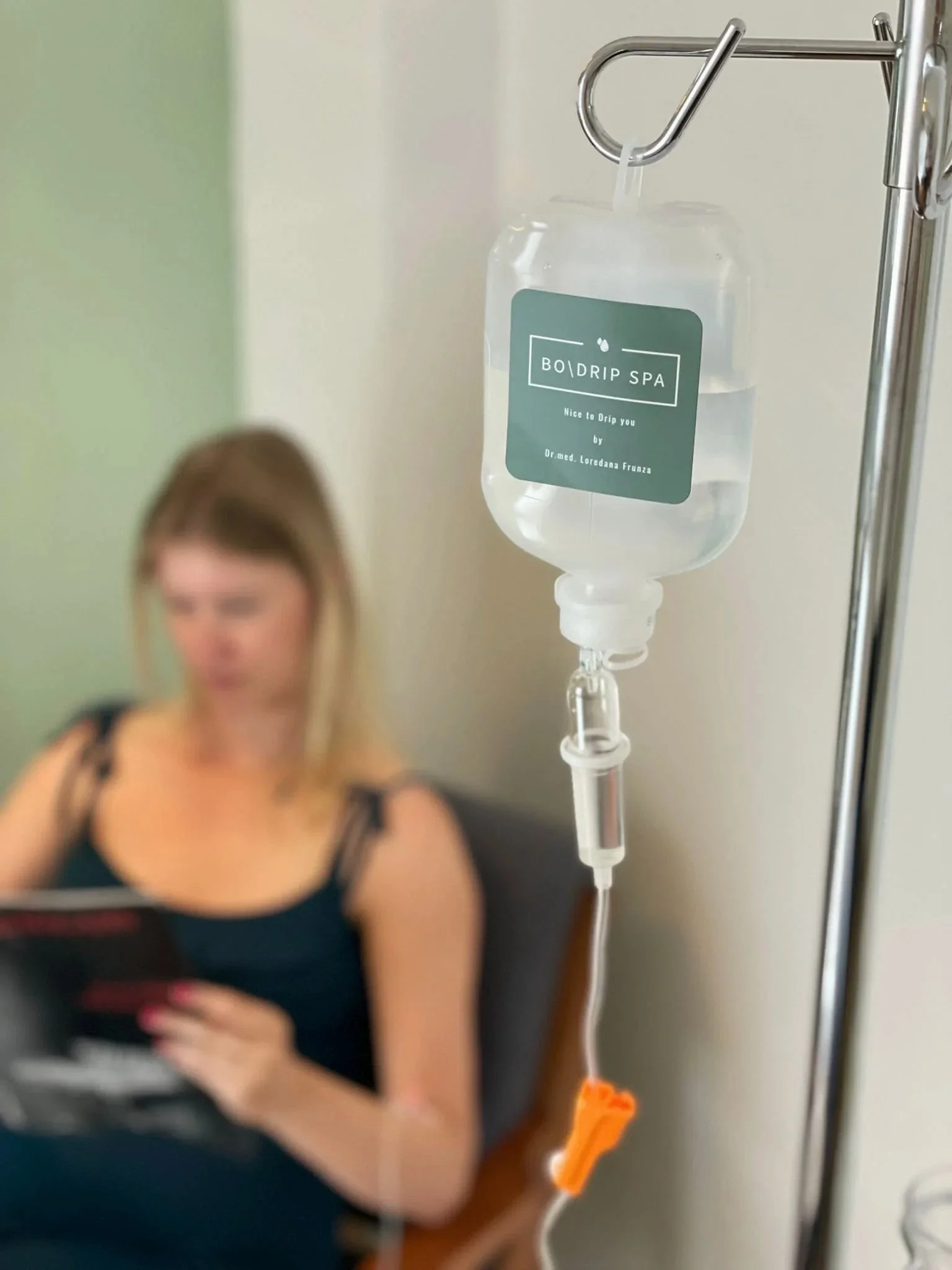 Infusionstherapie oder Drip Spa ist eine medizinische Behandlungsmethode, bei der Flüssigkeiten, Vitamine, Mineralien oder Aminosäuren direkt in die Blutbahn eines Patienten, über einen kleinen Venenzugang, verabreicht werden. Die Behandlung soll einen natürlichen Energieschub geben, Nährstoffdefizite ausgleichen und verschiedene gesundheitliche Beschwerden lindern. Mögliche Anwendungsgebiete sind unter anderem: